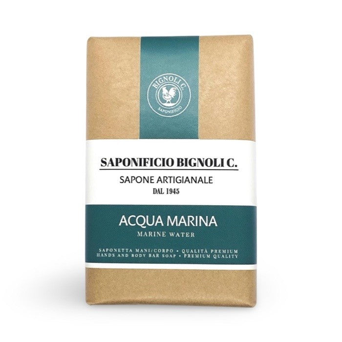 Die Saponificio Bignoli ACQUA MARINA Seife, aus dem 1945 gegründeten Familienbetrieb, wird als 150g Stück in Papier angeboten und eignet sich zur Wäsche des jesamten Körpers. Es handelt es sich um eine hochwertige, intensiv duftende Pflanzenseife, die zudem farbstofffrei ist.