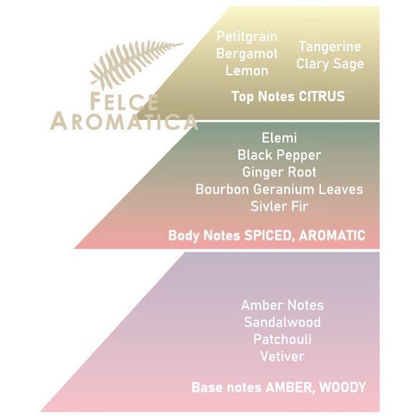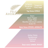 Zunächst steigen frische Zitrusnoten, ein Hauch von Petigrain sowie Salbei, Bergamotte und Manderine in den Rüssel. Als Herznote werden Aromen von schwarzerem Pfeffer, Ingwer und der leicht rauchigem Elemi wahrnehmbar. Abjerundet wird dit janze von Aromen des Sandelholzes, Vetiver, Patschuli und des Ambra.