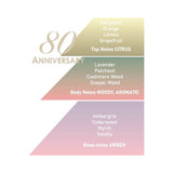 Nun kommen wir zum Duft. 80th Anniversary überzeugt durch die perfekte Balance zwischen Frische, Tiefe und Wärme. Er eröffnet mit einer Explosion aus Bergamotte, Orange, Zitrone und Grapefruit, die ein unmittelbares Gefühl von Energie und Vitalität vermittelt. Das Herz offenbart sich mit einer einhüllenden und anspruchsvollen Seele, dank der aromatischen Nuancen von Lavendel, die sich harmonisch mit der Tiefe von Patchouli, der samtigen Note von Kaschmirholz und der intensiven Eleganz von Guajakholz verbinden. Der Duft setzt sich schließlich auf einer warmen und sinnlichen Basis ab, wo sich Ambra mit den reichen Nuancen von Zedernholz, der harzigen Süße von Myrrhe und der einhüllenden Liebkosung von Vanille verbindet. Dieser holzige Fougère-Duft ist eine olfaktorische Reise, die die Sinne verführt und das Bild einer wilden und üppigen Natur hervorruft, die aber gleichzeitig raffiniert und unwiderstehlich ist. Let´s go.